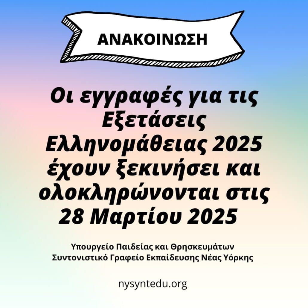 «Ανακοίνωση σχετικά με τις εξετάσεις Πιστοποίησης Επάρκειας της Ελληνομάθειας για την περίοδο Μαΐου 2025 – ΕΞΕΤΑΣΤΙΚΟ ΚΕΝΤΡΟ 10004 (Consulate General […]